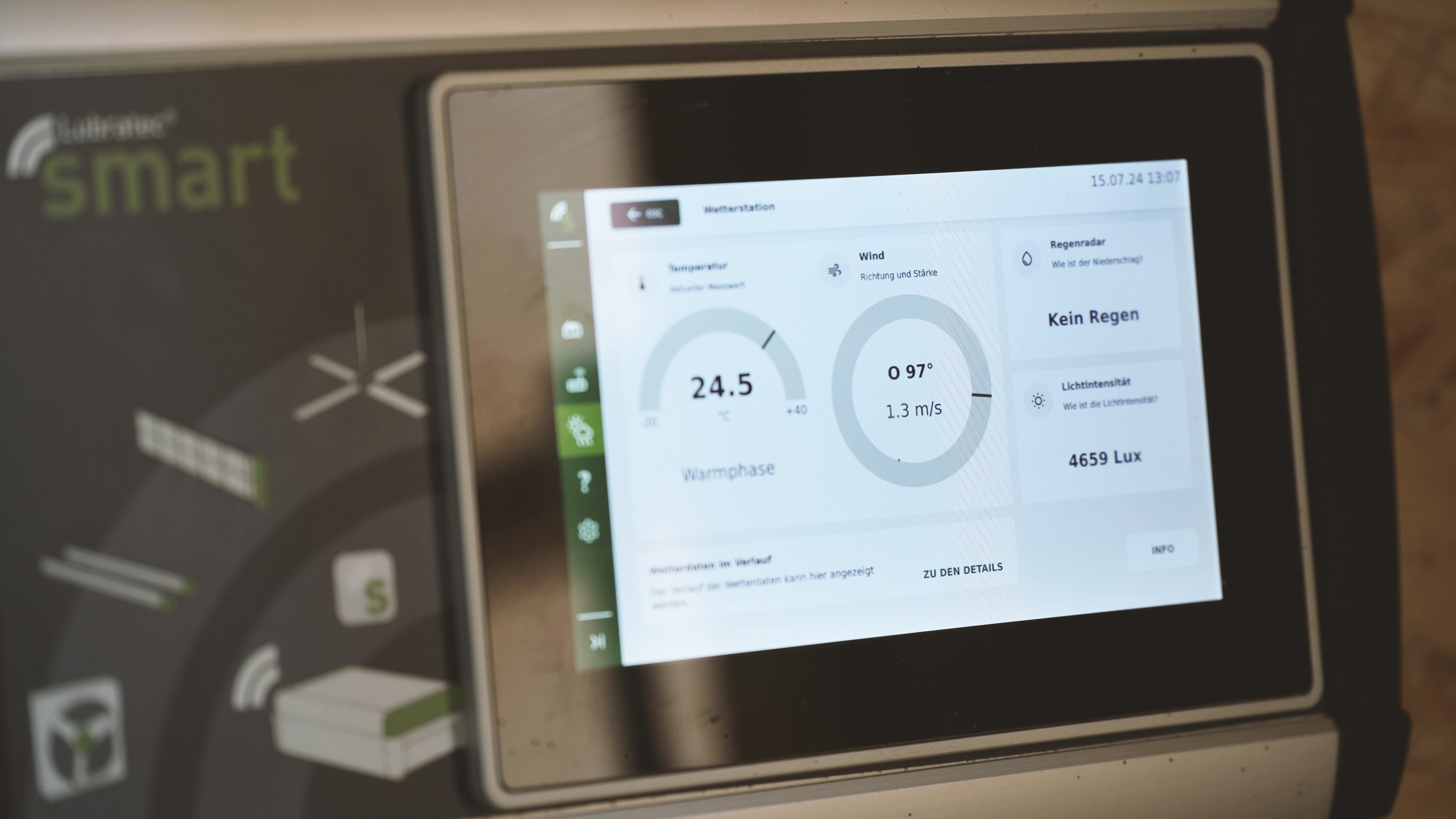 The control logic of Lubratec Smart is based on many years of practical experience from outdoor climate stables and was developed in close cooperation with vets and farmers. Dynamic control algorithms are linked with intelligent if-then functions and ensure precise coordination between sensors and climate control products - for greater animal welfare, higher efficiency and maximum operational reliability.