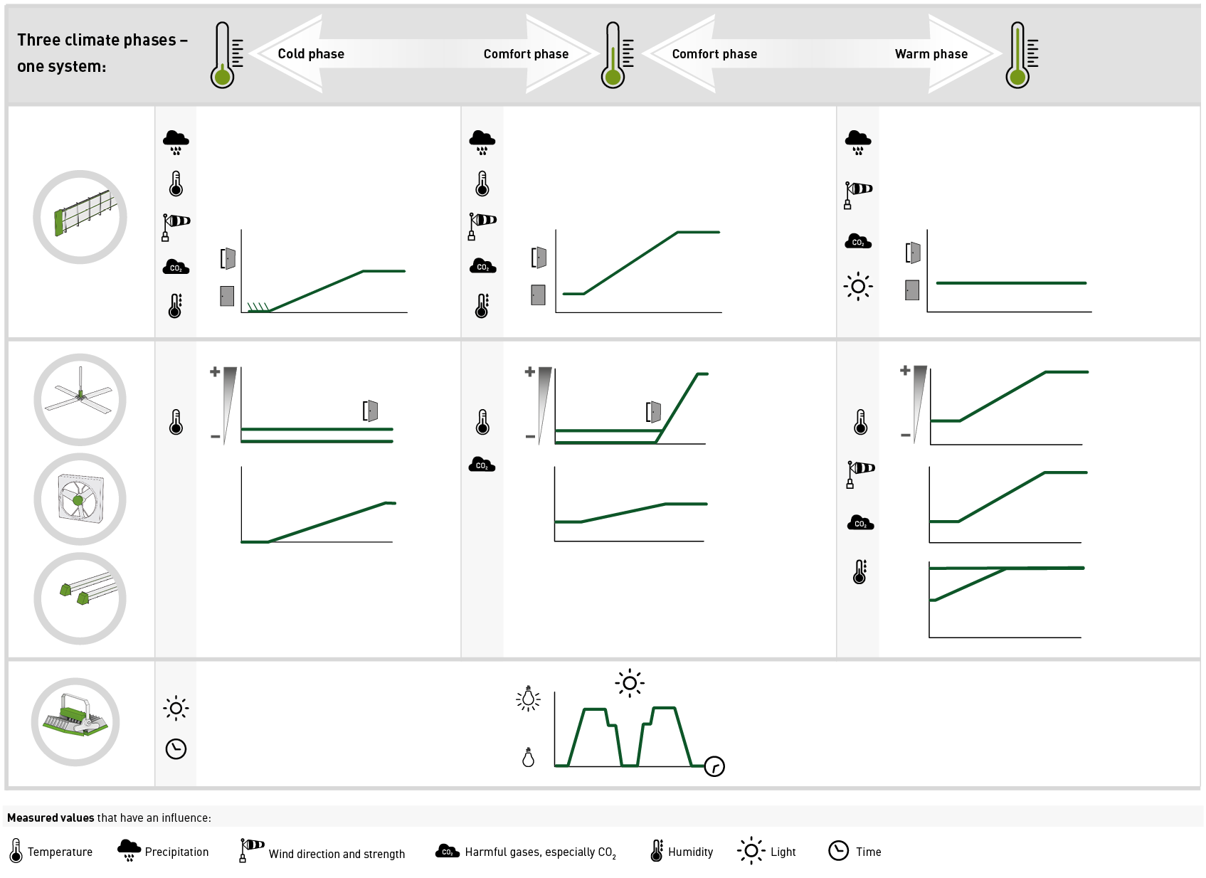 During the cold phase, the ventilation is regulated depending on the outside temperature, wind, rain and harmful gas levels in the barn. Shock ventilation enables air to be exchanged as required with minimal heat loss.
