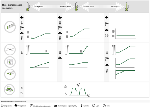 In the comfort phase, the control of the ventilation is primarily temperature-dependent. The system is always ready to react quickly to changes in the weather. Fans also ensure a minimum air exchange rate, especially when there is no wind.