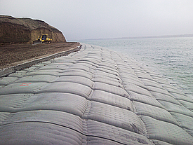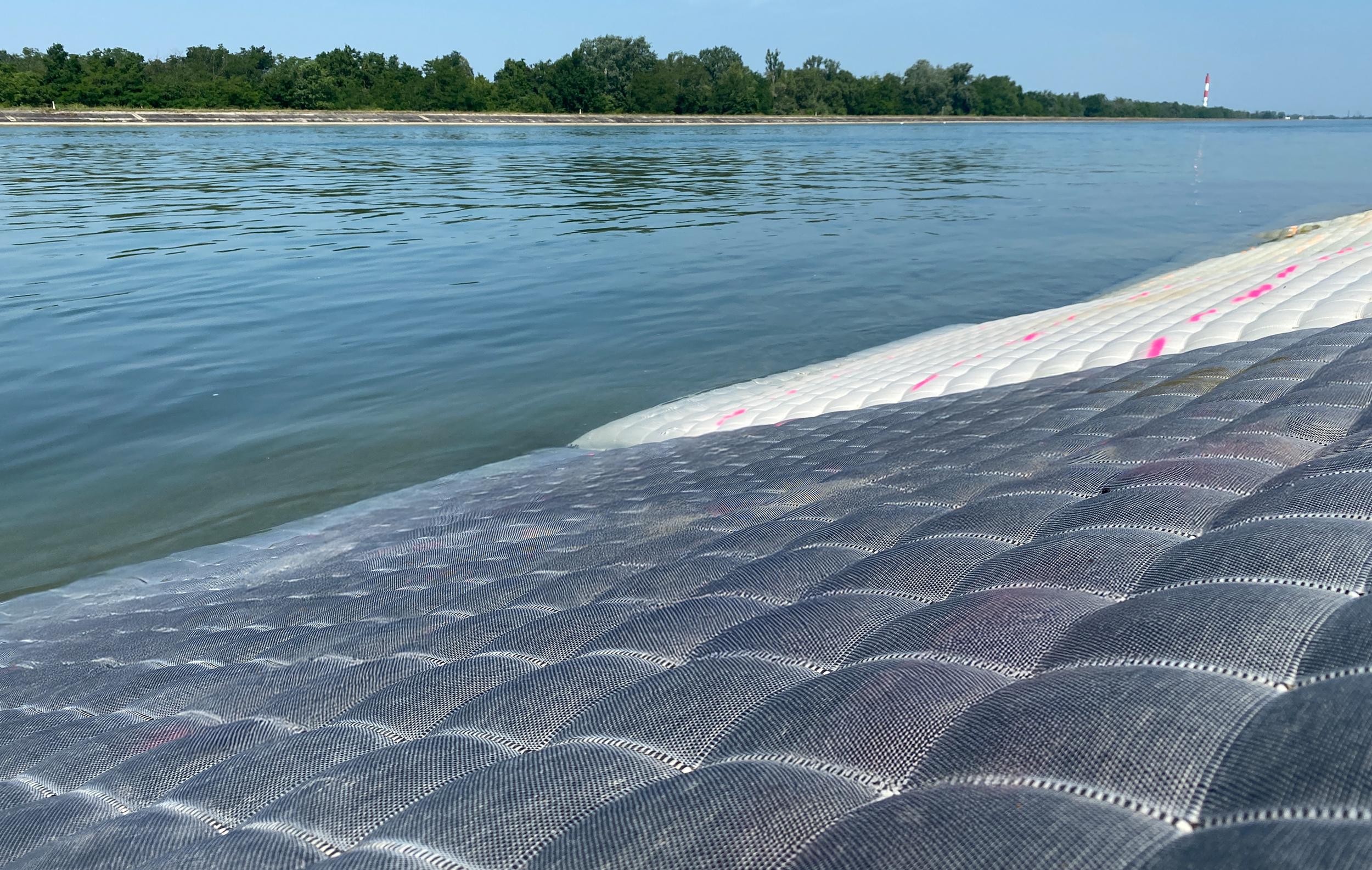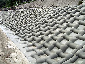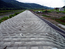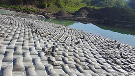 Incomat Flex consists of individual units ("cushions") that are joined together by connection strips. The taper in the area of the webs acts as a predetermined breaking line. Woven-in filter points at the corners of the cushions enable the reduction of hydrostatic pressures below the revetment. The tapered connecting strips give the mattress a certain two-dimensional flexibility in the event of subsidence in the subsoil or if the mattress is washed out.