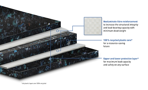 Basetrac Plate | Load distribution, floor protection | Neolaminate core, 100% recycled, 23 mm thick | Cable trays, wind farms, storage areas |