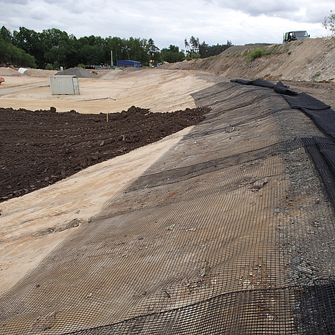 At the same time, a permanent chemical resistance (pH > 2 to pH < 13) under load was required for the reinforcement grid, since it can come into contact with waste materials and contaminated eluates. Due to using the extremely flexible Fortrac geogrid, space-saving and UV-protected storage of 8 m long overhangs was also achievable for the section constructed later at the edge of the site (approx. 0.5 m wide, approx. 2 cm high).