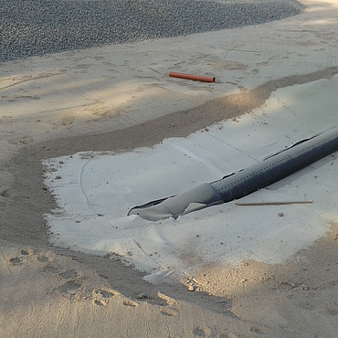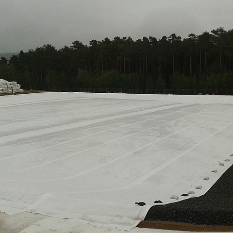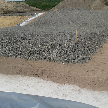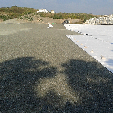 The protection of the geomembrane against damage was achieved with the BAM-approved protective nonwoven HaTe used in combination with recycled sand, i.e. with already contaminated waste materials and without the additional costs of natural building materials. The protection of the drainage layer against penetrating fine particles was achieved by using a separating nonwoven. This made it possible to dispense with an otherwise necessary, but much more grain graded layer, which reduces the landfill volume.