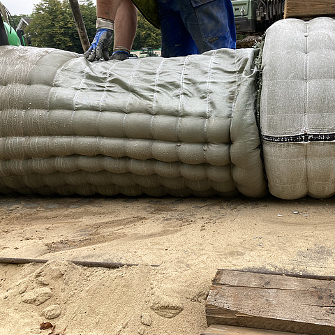 Incomat Pipeline Cover protects the new pipelines against buoyancy and mechanical impacts. To this end, the IPC elements were customised precisely to the specific conditions on site. Thanks to the high-precision prefabrication, the IPC system guarantees a constant thickness of the pipe coating. Another advantage is the high degree of flexibility. Thanks to the flexibility of the textile formwork, the pipe cladding adapts easily to the two required bends of the pipework (25° and 45°). The fast and efficient installation of the IPC pipe cladding also proves to be superior to conventional formwork techniques in terms of construction time. In contrast to other methods, no time-consuming formwork assembly and disassembly is required on site. The filling time of an IPC element is just five minutes thanks to the factory-fitted filling spouts.