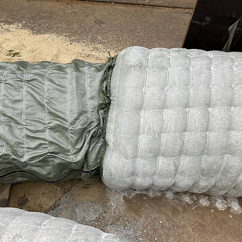 The Incomat Pipeline Cover (IPC) pipeline protection system was installed as buoyancy protection to counteract the buoyancy that occurs when pipelines are laid below the water level. The innovative concrete coating also acts as protection against mechanical impacts on the pipelines. Due to the different diameters of the pipelines - 300 mm for the oxygen pipeline and 400 mm for the gas pipeline - as well as the accompanying cables and wires, the result was an ‘egg-shaped’ cross-section. As the tender only specified concrete covers with a length of 73m for each pipe, the choice of construction and therefore the thickness of the cover was at the discretion of the contractor. In this case, the decision was made in favour of the IPC system. Incomat concrete mattresses consist of two high-tensile synthetic fabric layers that are connected to each other by regularly arranged spacers or weaves. They serve as textile formwork for the production of constant concrete cross-sections that can be individually and flexibly adapted to complex installation situations, pipe curvatures and different pipe diameters. For the IPC system, the Incomat standard concrete mattress is manufactured into hose elements that correspond to the respective pipe dimensions. On site, these customised IPC units are then placed around the pipe, sealed with factory-fitted industrial zip fasteners and filled with concrete via a filler neck. Prior to the production of the IPC units, the contractor and HUESKER were in close contact in order to optimise the design. In addition to the minimum weight to ensure buoyancy safety, the maximum permissible weight was another critical factor, as the pipeline and IPC were to be lifted and positioned in the sewer with cranes after being filled with concrete. For this reason, a concrete thickness of 10 cm was selected for the 400 mm pipeline and 6 cm for the 300 mm pipeline. The installation and filling of the IPC elements took less than a day for each pipeline. After the concrete had hardened and been inserted into the canal, divers ensured that it was positioned correctly. The work was carried out in two night shifts so that shipping traffic on the canal was not affected