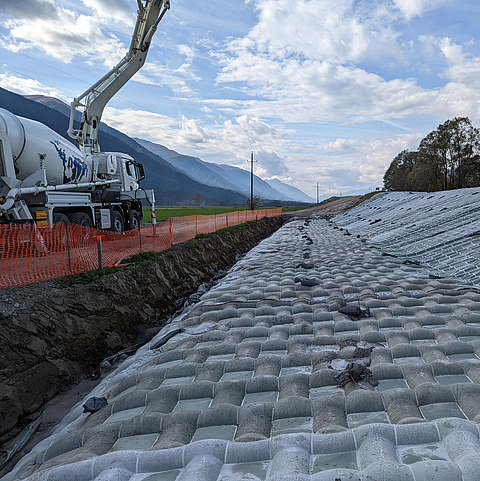 To prevent damage that could jeopardise the stability of the dyke, it was necessary to protect the overflow channel with an erosion-resistant surface layer. The chosen system was Incomat Crib 10.200, which is characterised by its ease of installation and long service life. Incomat Crib consists of two layers of woven geotextiles (PA/PE) that are connected in a grid pattern. After filling with concrete, the system takes the form of a tubular grid with permeable intermediate areas. In order to prove the performance of the system, the Vienna University of Technology carried out physical model tests in 2010, which demonstrated the erosion resistance of overflow channels covered with Incomat Crib at flow velocities of more than 10 m/s and a specific discharge of up to 2.5 m³/(s*m).
