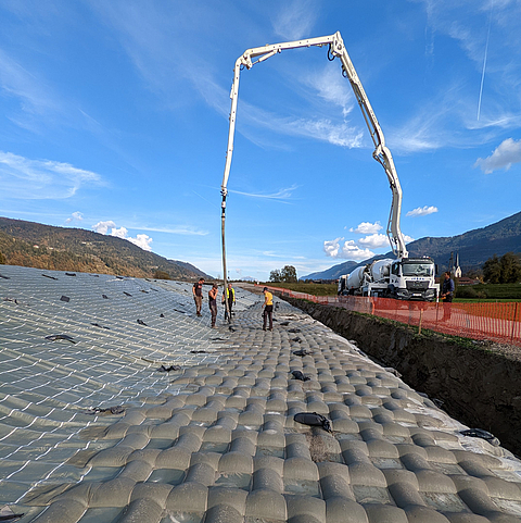 The Gailtal valley is a region in Austria that has been affected by flooding several times in recent years - most recently in October 2018 with massive damage and devastation. The flooding was caused by a combination of heavy rainfall and dam failures. The floods caused dams to breach or overflow uncontrollably, causing water and material such as mud, timber and rocks to cause severe damage throughout the Gailtal valley. In order to prevent future flood damage, the existing dyke and the banks of the river were reinforced and secured by raising the dams. In order to control the overflowing of the Gail in the event of flooding, an overflow section was planned and constructed near Rattendorf, whereby it was necessary to protect the reinforced dyke against erosion and hydraulic effects during flood events.