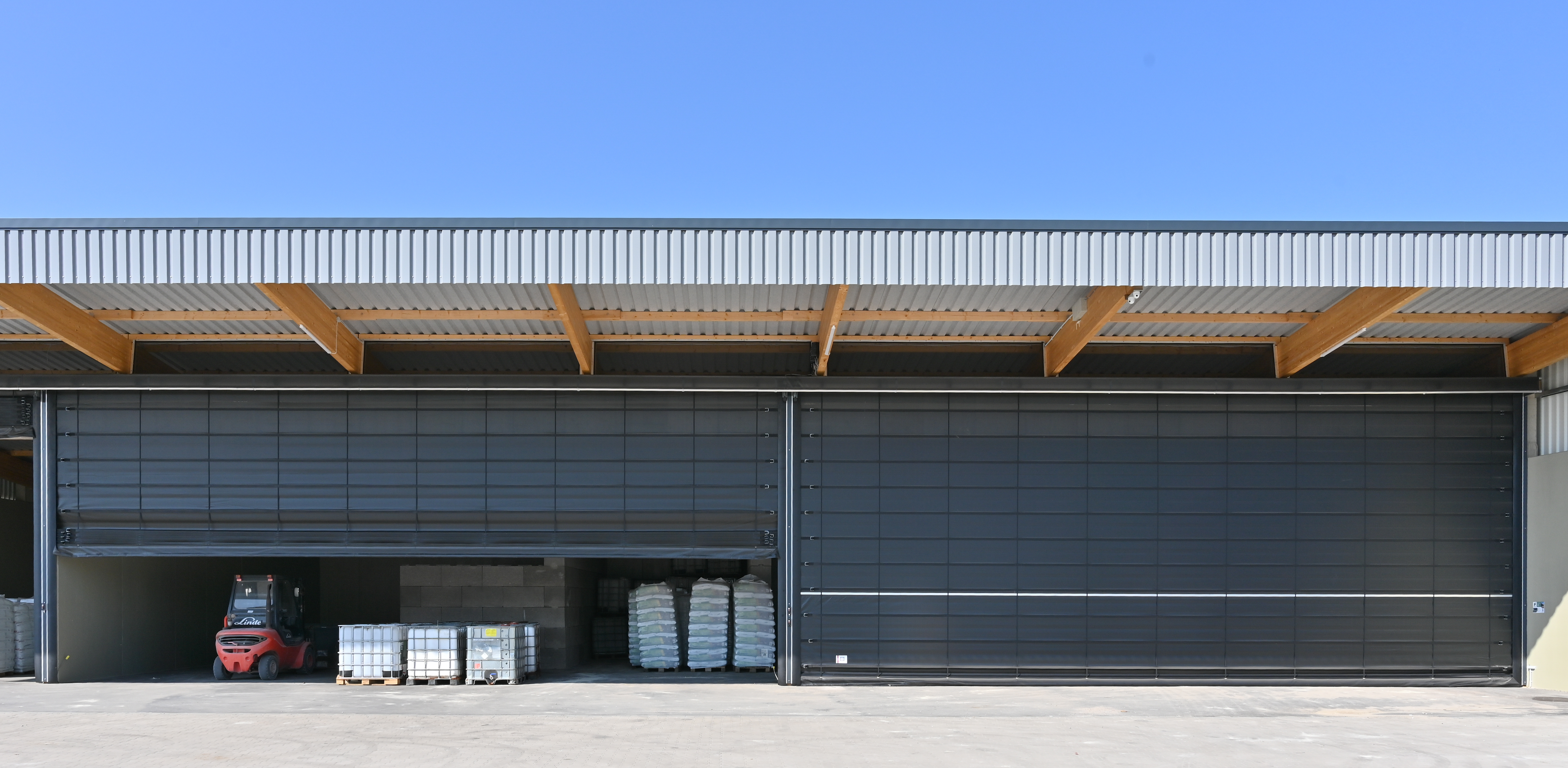 Raiffeisen Ems-Vechte eG, based in Lorup, is a co-operative in the agricultural supply sector. It produces and sells feed and fertiliser for regional agriculture. In the area of fertiliser and pallet storage, the requirement was to reliably protect the existing hall openings from the effects of the weather. The solution not only had to meet the high logistical requirements - daily access by lorries as well as forklift and conveyor belt traffic - but also protect the sensitive components against the corrosive effect of the stored fertilisers.