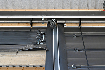 After comprehensive consultation with HUESKER Synthetic GmbH, Raiffeisen Ems-Vechte eG decided in favour of Tectura folding fronts. A total of two folding fronts measuring 14 m × 6 m and one folding front measuring 7 m × 6 m were installed in the fertiliser and pallet storage area. A black translucent PES tarpaulin was used.