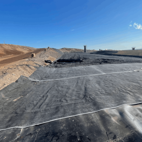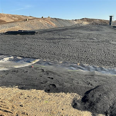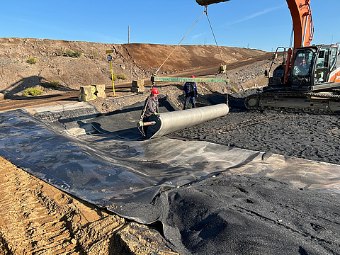 Tektoseal® Active PFAS was used as the central barrier. The leaching PFAS are reliably removed from the leachate via ion exchange and adsorption and permanently bound within the geotextile. The dedicated area is base-sealed with a plastic sealing membrane (KDB) and features a separate leachate collection system that directs the leachate in a controlled manner into a sampling shaft. Regular monitoring takes place there to document the system’s effectiveness. The planned area covers a total of around 5,000 m² and is expected to be backfilled to a height of approximately 10 m. The special active mats were laid directly onto one of the welded plastic waterproofing membranes. A total of 28 rolls of Tektoseal Active PFAS 3000 AI WB (5.10 × 40 m) were installed in a roof-shingle pattern with a 25 cm overlap  and immediately backfilled with 30 cm of slag to secure them against the wind. The work was carried out by the construction company Schwind-Bau from Leverkusen under the technical supervision of HUESKER.