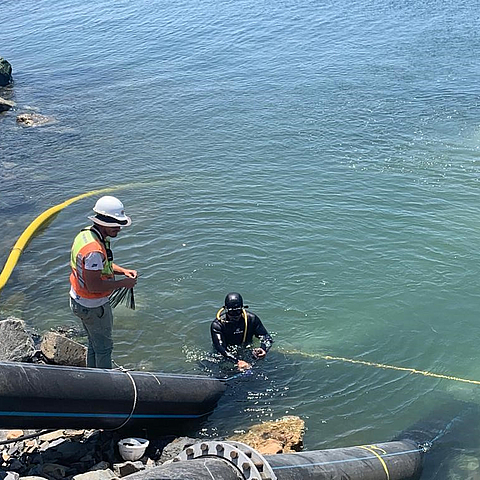 In 2017 and 2018, there was an acute water shortage in the Western Cape province of South Africa. Even the nearby dams were unable to meet the water needs of the Western Cape region. One of the reasons for the shortage was the large influx of foreign refugees into the Western Cape housing estates, which meant that the existing supply infrastructure could no longer meet demand. The City of Cape Town (CoCT) then decided to build several desalination plants to produce fresh water using the reverse osmosis process. Eight sites were originally planned, but today only three desalination plants are in operation. One of these is the V&A Waterfront desalination plant in Cape Town harbour. During construction, flexible HDPE pipelines with different geometries were laid into the water on an embankment. Due to the exposed location on one of the harbour's busiest waterways, the pipes also needed to be protected against damage during installation and from shipping traffic.