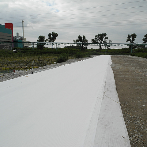 The clarification ponds Süd in Bitterfeld-Wolfen are located in the Bitterfeld industrial park. Two of the three existing basins were to be covered with geosynthetics and soil material as part of a renaturation measure. The basins have a depth of up to 6 m and the contents range from sewage sludge to chemical waste and scrap. The aim of the measure was to prevent contaminated water and air from entering the environment and to prevent direct contact between living organisms and the ponds.