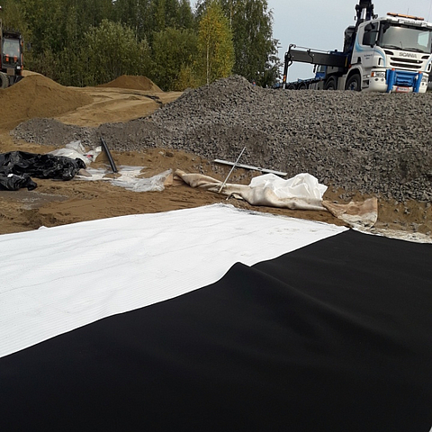 The first idea was to filter out contaminants before entering the pond but it was impossible to identify the main influx location to the pond. Therefore the only remaining solution was to install an efficient filter system in the pond which will stop hydrocarbons and PAH to reach the groundwater. The decision was made to renew the whole pond and to improve the geotextile filter layer on the bottom. Slopes were sealed with a geosynthetic clay liner and the horizontal bottom of the pond (ca 100m2) was covered by two layers of an active geocomposite for groundwater protection and contaminated site remediation. In this project Tektoseal Active AS was installed on top in order to filter out hydrocarbons. It consists of two nonwoven layer and in-between an oil absorption agent is mechanically reinforced. This fabric reliably binds petrochemical products. The versatile geocomposite can be used in water, on water surfaces and on land.